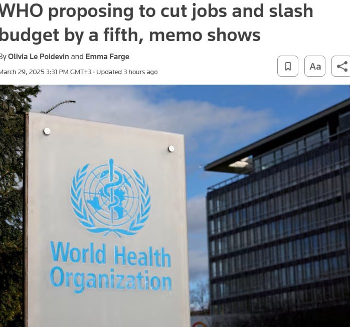В ответ на пост ВОЗ планирует сокращение персонала из-за выхода США из организации. Об этом сообщает Reuters cо ссылкой на внутренний документ организации. Решение Трампа выйти из Всемирной организации здравоохранения привело к тому, что её бюджет сократился на 18%, передаёт агентство. 🟩 Подписаться | Прислать новость | Читать аналитику