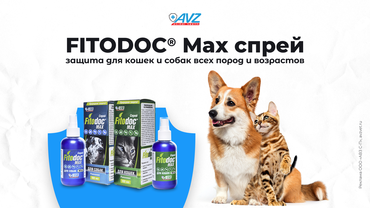 Erid: 2Vtzqv56f2G Реклама ООО "АВЗ С-П" ИНН: 5042113943 Всех собак и кошек нужно защищать от блох, вшей и клещей, и желательно еще от комаров. Дело не только в укусах, которые доставляют много неприятностей нашим четвероногим, но и в опасности заразиться. В этой статье мы расскажем об универсальном репеллентом спрее FITODOC® Max, который можно применять для защиты кошек и собак всех пород и возрастов. – Отпугивает комаров, а значит, снижает риск заражения дирофиляриозом (личинки паразита попадают в организм собаки, когда комар начинает пить кровь). – Защищает от укусов вшей, блох и клещей до 4 недель. – Подходит котятам и щенкам с 2-месячного возраста, а также ослабленным, беременным животным. – Делает шерсть более блестящей и шелковистой, снимает статический эффект за счет диметикона, маскирует неприятные запахи благодаря эфирным маслам. – Легко взять на природу в качестве дополнительной защиты для питомца. Спрей FITODOC® Max работает в двух направлениях: отпугивает клещей и н