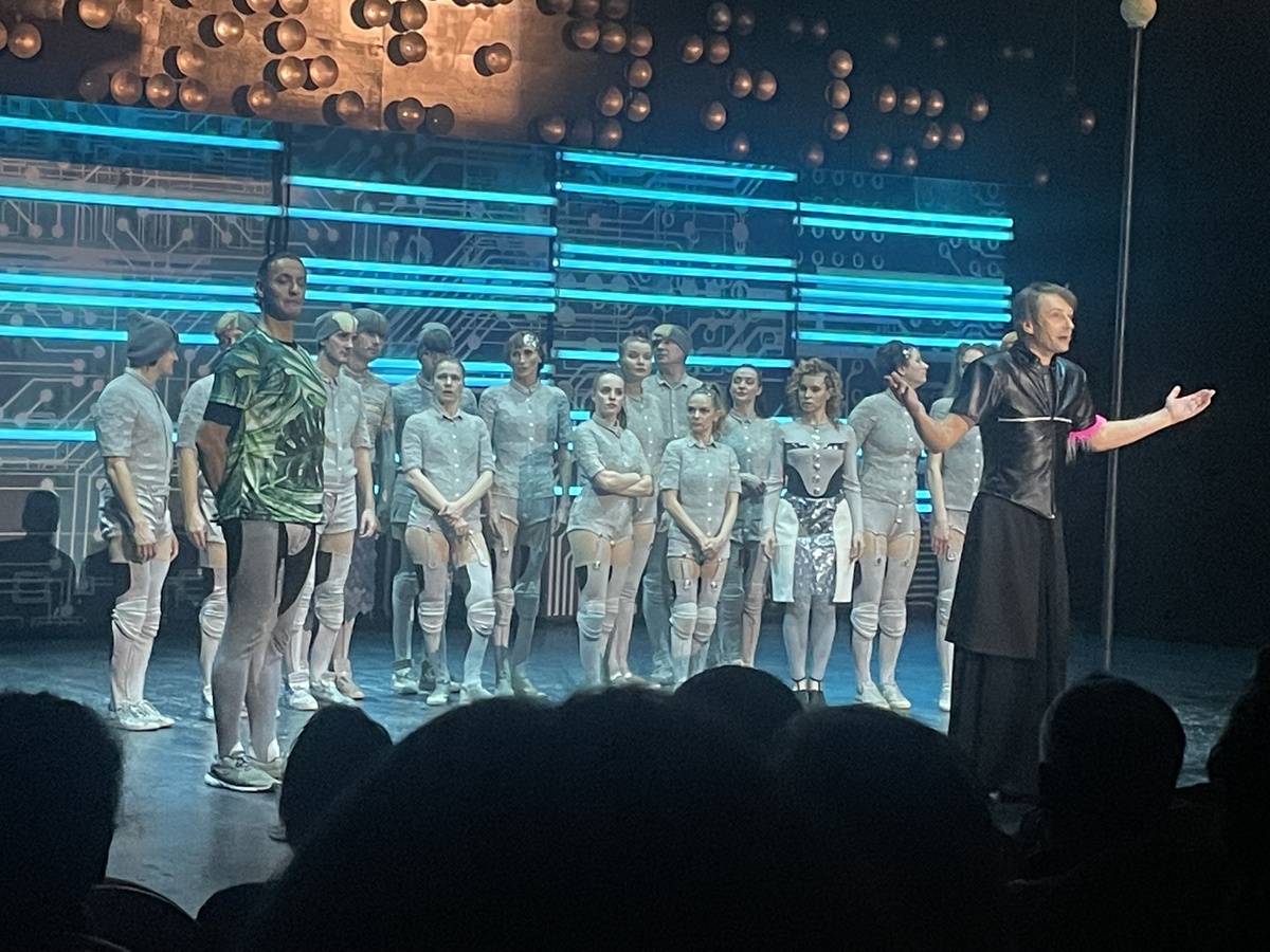 В целом постановка в Модерне практически полностью следует роману, но некоторые сцены сглажены и поставлены очень изящно, например в книге жители участвуют в оргии, а на сцене – это всего лишь дискотека, если не читать оригинал, то ничего такого и не подумаешь 😊 Еще из явных осовремениваний – в отличие от оригинала, в котором символом потребительского бога выступает Форд, здесь все происходит во славу Цукербергу 😉
