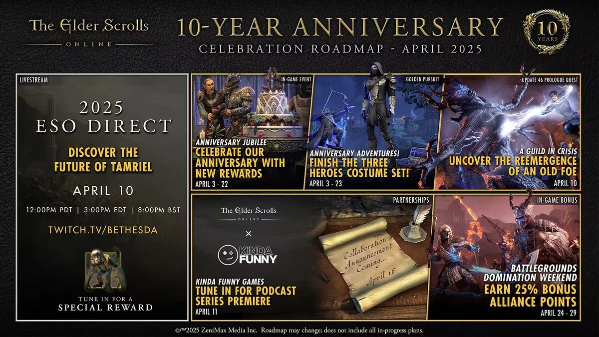 Апрель для игроков The Elder Scrolls Online будет насыщенным — нас ждут события, бонусы, обновление 46, новые развлечения в честь 10-летия и большой ESO Direct. Команда The Elder Scrolls Online подготовила новое руководство и дорожную карту на апрель со всеми основными событиями, начиная с события «Фестиваль шутов», которое уже стартовало. Ежедневные награды за вход в игру начнутся 1 апреля, и вы сможете получить ряд наград, включая новую настраиваемей действие «Урожай Муркмира». Чтобы дать старт 11-й годовщине, 3 апреля стартует «Юбилей», открывающий новую кампанию Golden Pursuits. Но главным событием, скорее всего, станет ESO Direct, который состоится 10 апреля. Именно на нем мы узнаем о новом направлении развития The Elder Scrolls Online, о сезонных обновлениях, новых функциях и режимах, а также о том, чего еще стоит ожидать. Также мы узнаем, как и когда можно будет получить DLC Fallen Banners для игроков, не являющихся обладателями подписки ESO Plus.
