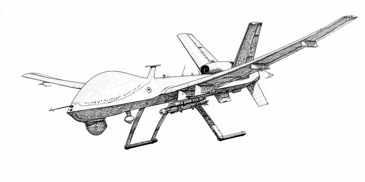 Создано на основе запроса: a reaper drone in mid flight drawn with a thousand circles drawn with AutoCAD