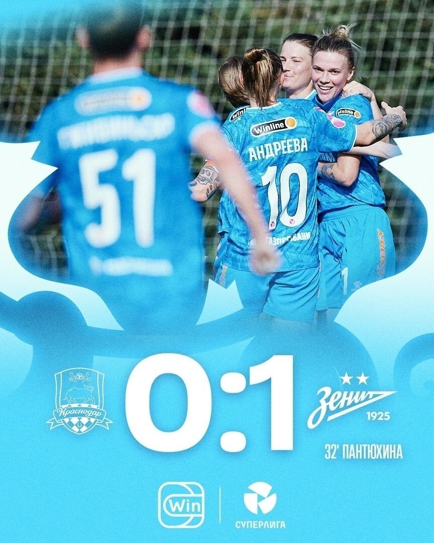 Женская футбольная команда «Зенит» в матче четвёртого тура Суперлиги одолела сегодня «Краснодар». Встреча, которая прошла в столице Кубани, закончилась со счётом 1:0 в пользу сине-бело-голубых. Точной на 32-й минуте была Екатерина Пантюхина. После этой победы «Зенит» с 10 очками занимает третье место в турнирной таблице. Лидирует же с 12 очками московский «Спартак». Напомним, ранее главный тренер мужского «Зенита» Сергей Семак рассказал о подготовке к матчу с «Рубином» и об атмосфере в команде после волны негатива, обрушившегося на петербургский клуб в последние дни.