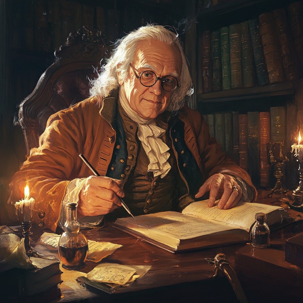 Создано на основе запроса: An 18th-century study filled with books and candlelight. Benjamin Franklin, an elderly man with white hair and round glasses, sits at a wooden desk, writing with a quill on aged parchment. The atmosphere is warm and scholarly, with ink bottles and old books scattered around. --- Автоперевод: Исследование 18-го века, заполненное книгами и при свечам. Необычно вышло? 🤔 https://dzen.ru/id/65c0c65c86e4f837c27b24d7 #ИИ #AI #нейросеть #midjourney #art