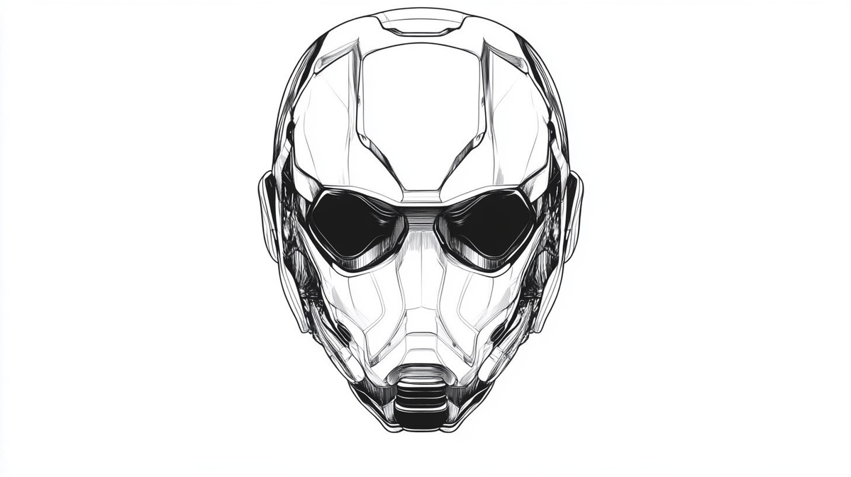 Создано на основе запроса: front view of VR full face mask, sinister design, black and white line art, simple
