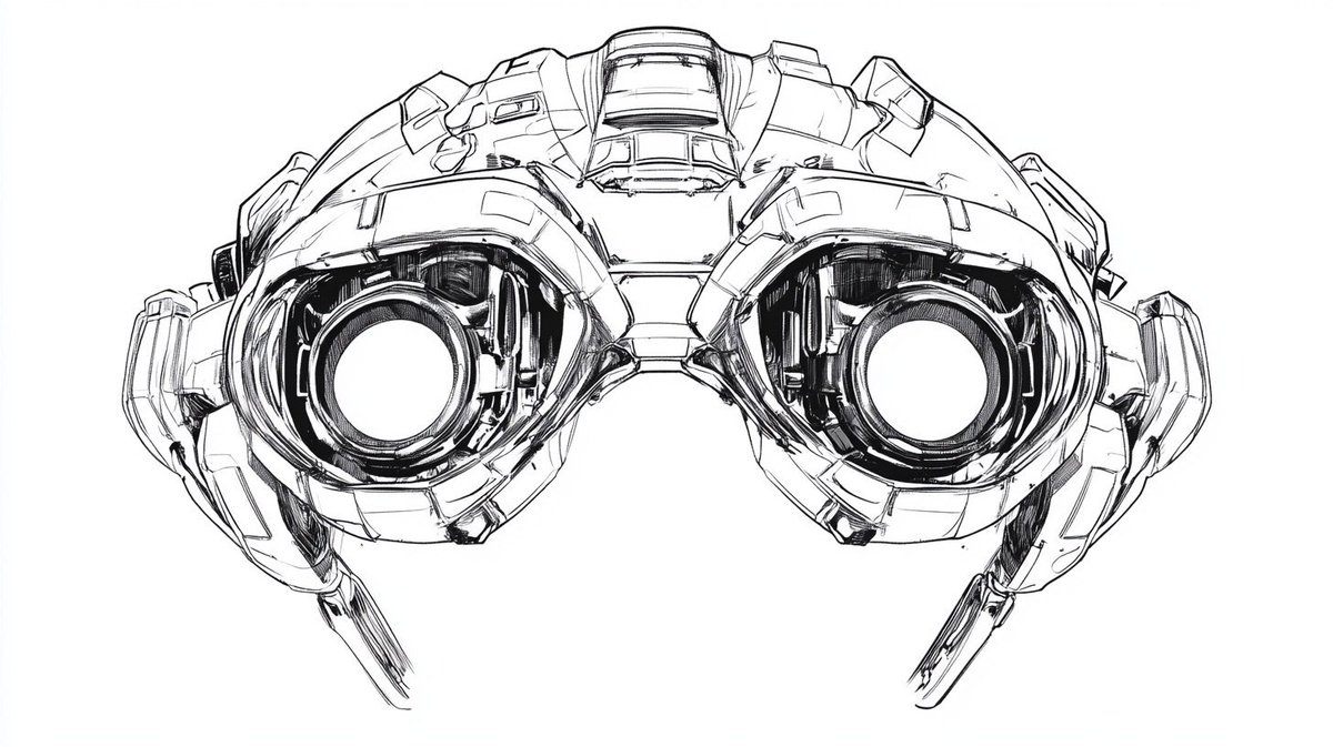 Создано на основе запроса: front view of sci-fi VR headset blue print, in black & white line art, large visor, sinister design