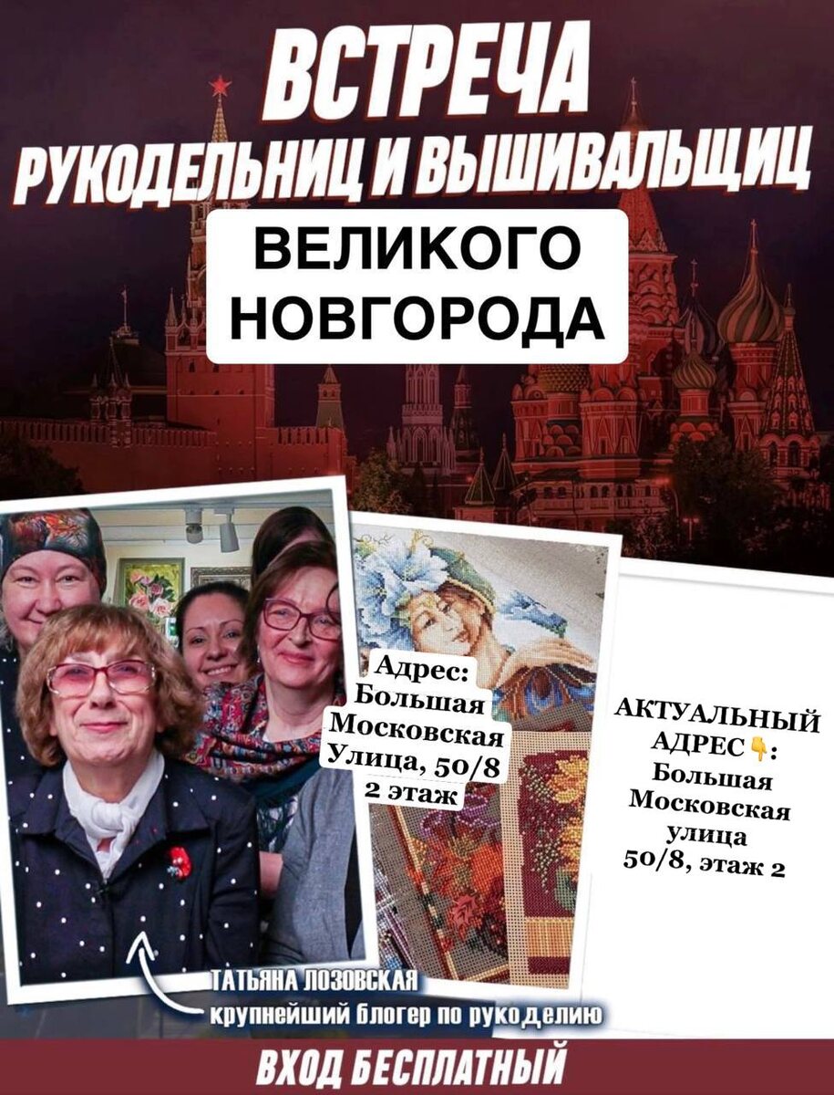 🧵✨ Вышивальщики и вышивальщицы, 12 апреля я еду в ВЕЛИКИЙ НОВГОРОД!!! Проведем день космовышивальщиц✨🧵 Адрес ИЗМЕНИЛСЯ: Воскресенский бульвар 10, магазин техники с уценкой «ЛЕНРЕМОНТ» АКТУАЛЬНЫЙ АДРЕС: Большая Московская улица, 50/8, 2 этаж 🤗ЖДУ ВАС С НЕТЕРПЕНИЕМ 🤗 Вход абсолютно бесплатный. А если у Вас остались вопросы, позвоните в Ленбагет на наш дежурный номер +7 921 586 27 24 и мы Вам с радостью поможем. До встречи! 🥰