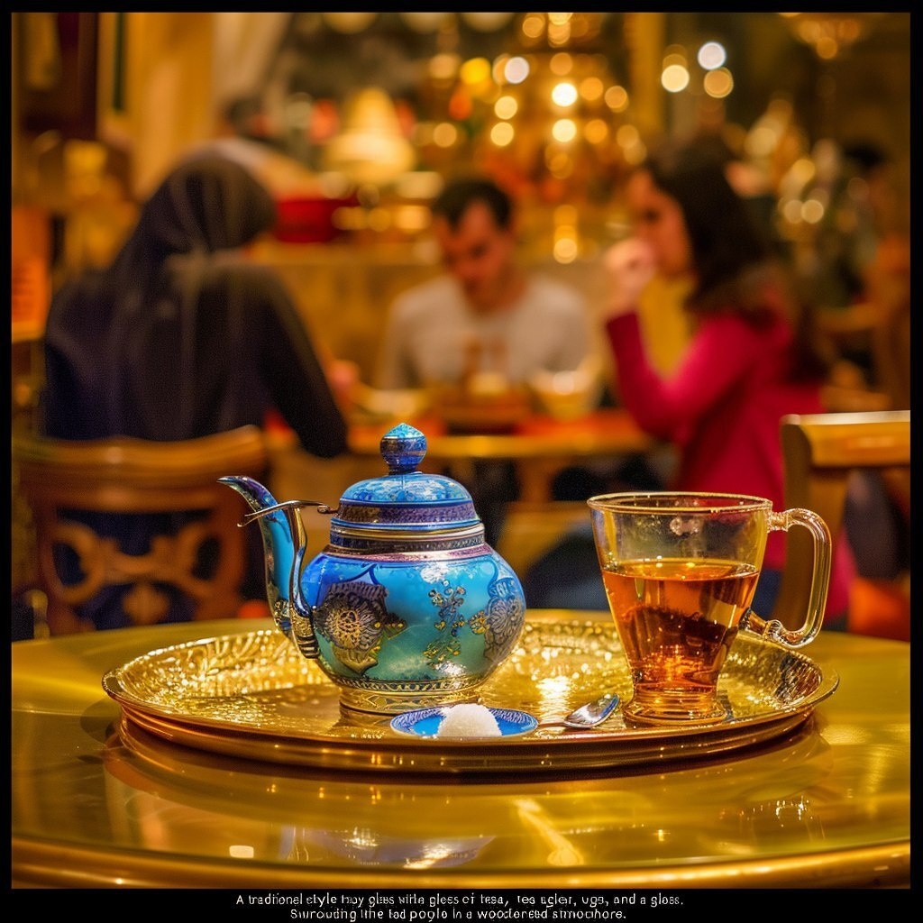 Создано на основе запроса: "A traditional Eastern-style tea house. A brass table with a golden tray holding a glass of tea, a small blue ceramic teapot, a bowl of sugar, and a glass of water. Surrounding the table are wooden chairs with people sitting in a relaxed atmosphere. In the background, hookahs and warm ambient lighting create a cozy and inviting scene. Soft focus on background elements for a cinematic depth of field."