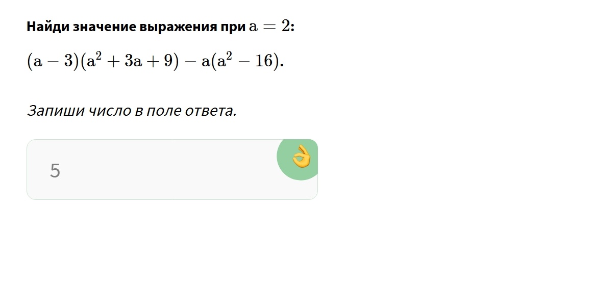 Сначала упростим выражение (a−3)(a2+3a+9)−a(a2−16) Раскроем скобки в первом произведении: (a−3)(a2+3a+9)=a(a2+3a+9)−3(a2+3a+9) =a3+3a2+9a−3a2−9a−27=a3−27 Теперь раскроем скобки во втором произведении: −a(a2−16)=−a3+16a−a Сложим полученные выражения: a3−27−a3+16a=−27+16a Подставим a=2 в упрощенное выражение: −27+16⋅2=−27+32=5 Ответ: 5