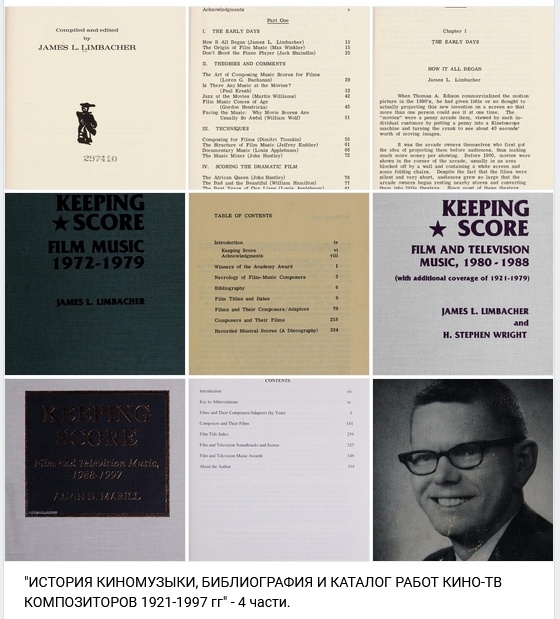 ИЗ КНИГИ "On the Screen.A Film, Television, and Video Research Guide" (1986, Kim N. Fisher) 451. Limbacher, James. Film Music: From Violins to Video. Metuchen, N.J.: Scarecrow, 1974. 835 стр. LC 73-16153. ISBN 0-8108-0651-7. "Film Music и его преемник и дополнение Keeping Score заполняют важный пробел в справочной категории фильмов и музыки. Limbacher объединяет раздел эссе о теории, комментариях и методах, касающихся музыки к фильмам, со вторым разделом фильмографии, дискографии и титров. Он предоставляет информацию о названиях фильмов и датах, а также о саундтреках к фильмам и их композиторах. Сегмент также упорядочен по композиторам, с саундтреками к фильмам, приписываемыми каждому из них, указанными ниже. Дискография, упорядоченная по названию фильма, ссылается на различные записи, а также на этикетку и идентификационный номер. См. также Keeping Score (