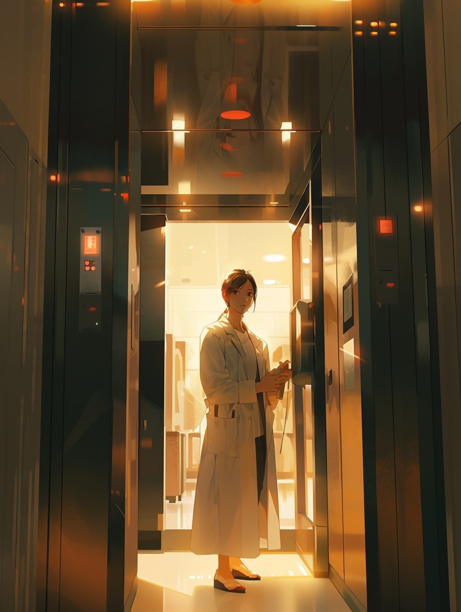 Создано на основе запроса: cinematic hospital elevator scene, doors open to reveal a stylish East Asian female doctor in her 30s, wearing a white coat, stepping out slowly with head slightly bowed, calm amidst chaos, warm hospital light spilling through elevator, semi-realistic composition, soft lens flare and cinematic shadows , surreal horror-tinged anime illustration, expressive brushstrokes and soft gradients, Mamoru Hosoda animation style