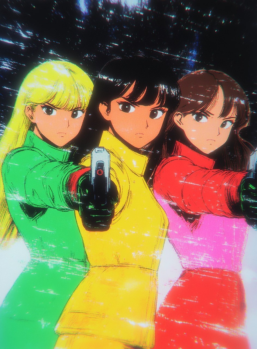 Создано на основе запроса: manga cover, Charlie's Angels in an action pose, in the style of Katsuhiro Otomo and Jean Giraud, bright colors, ultra-detailed, best quality, high resolution