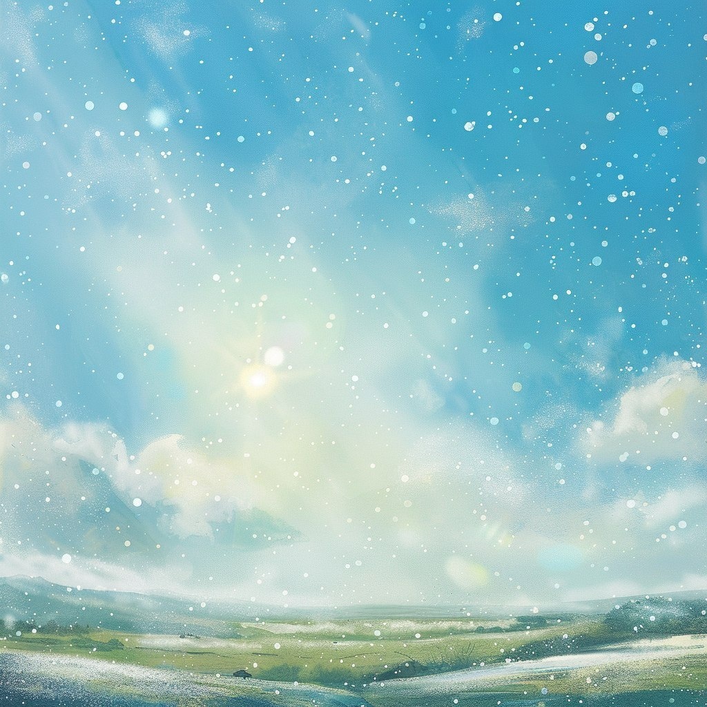 Создано на основе запроса: A soft pastel illustration in the style of Raymond Briggs, a bright blue sky with delicate snowflakes gently