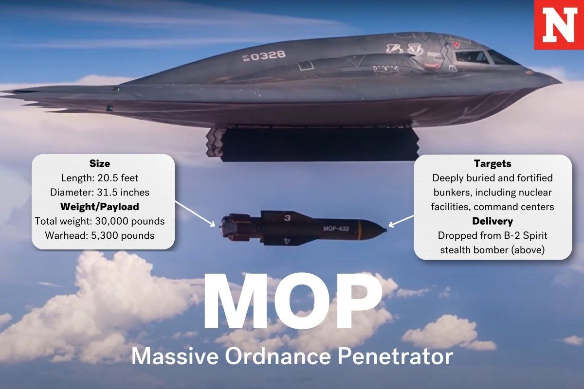 Мы уже писали о наращивании американской группировки ударной бомбардировочной авиации на плацдарме подскока в Индийском океане. В настоящее время число бомбардировщиков B-2 на авиабазе Диего Гарсиа (Индийский океан) достигло восьми единиц. Дополнительно были переброшены и самолеты топливозаправщики KC 135 (Stratotanker). Если проанализировать боевой радиус, то все говорит о том, что единственная цель англосаксов располагается в акватории Персидского залива. Бомбардировщики B-2 являются единственными носителями авиабомбы GBU-57 или Massive Ordnance Penetrator (MOP) — самой мощной управляемой противо-бункерной авиабомбы массой 13.609 кг (на фото). MOP способна перед взрывом проникать в землю на глубину до 61 метра или пробивать до 19 метров бетона.