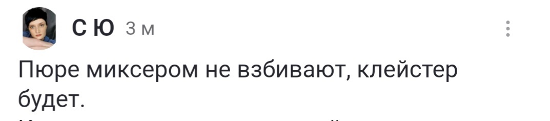"Знающие" хозяйки предупреждают- если взбить пюре миксером, получится клейстер. Вязкая противная субстанция, которую невозможно есть. Десятки женщин из статьи в статью пишут одно и то же: Бедняжки это пишут от необразованности (слышал звон, не знает где он). Ведь структуру картофеля нарушает не миксер, а блендер! Вот сударыня пишет, что пюре следует взбивать венчиком, а не миксером. Кажется она никогда не видела миксер в глаза... и не знает, что это и есть два венчика с "моторчиком". Уже с 1870 году хозяйки получили возможность облегчить себе взбивание: На эти девайсы выстраивалась очередь. Она бы покрутила пальцем у виска, услышав, что кто-то в здравом уме считает миксер не венчиком. Интересно, а мясо они тоже крутят на старинной ручной мясорубке? Или жуют сырым и выплевывают в тарелку, как в дикие времена? Давайте еще белье стирать на деревянной доске, игнорируя стиралку, чтобы все было какраньши. Дамы, миксер не вредит никак картофельному пюре, хватит распространять этот глупый ми