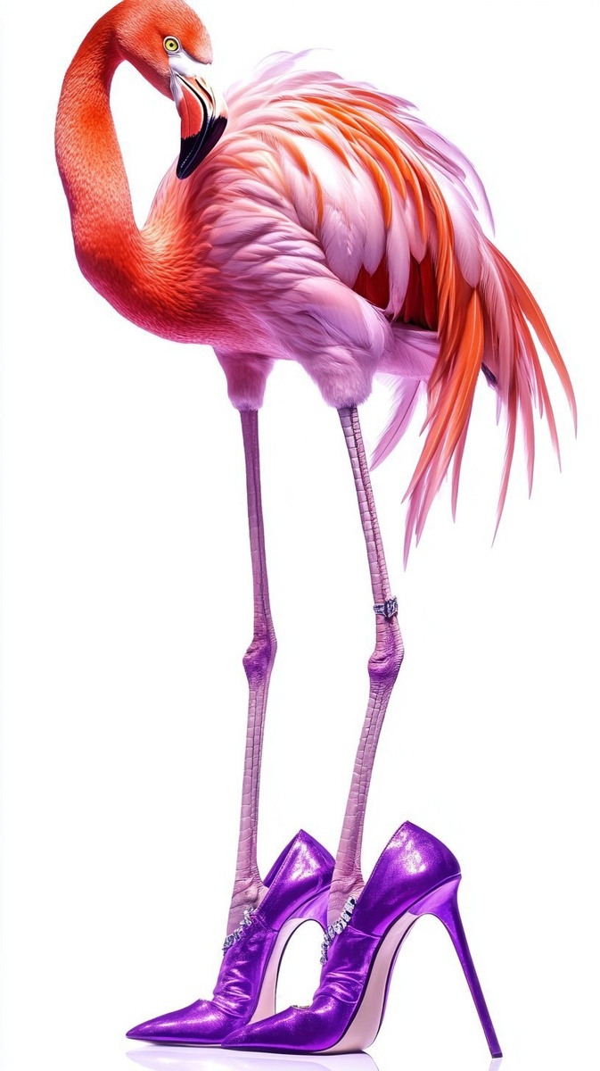 Создано на основе запроса: flamingo, anthropomorphic, purple high heels, fashion, model