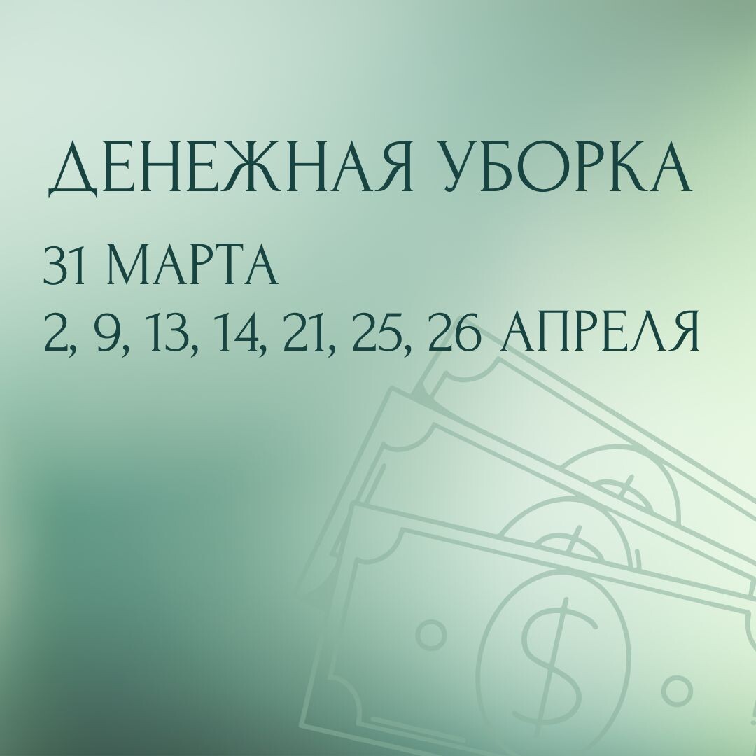 💰 МЫТЬЕ ДВЕРИ В АПРЕЛЕ! Вот и приближается середина весны, сезона обновления и процветания. Удачные даты для привлечения в дом благополучия: 31 МАРТА И 2, 9, 13, 14, 21, 25, 26 АПРЕЛЯ В эти дни благоприятно делать уборку вашего жилья, особое внимание уделите входной двери и преддверному коврику. СОХРАНЯЙТЕ, ЧТОБЫ НЕ ПОТЕРЯТЬ! Также очень благоприятно в эти дни чистить талисманы и амулеты Фэн-шуй! ⠀ Как это сделать правильно? ⠀ 🚛Разведите воду с морской солью. Соли должно быть немного, чтобы поверхностях не оставалось разводов. Туда же добавьте аромомасла (на выбор — апельсин, мята, лимон, герань). Этим раствором сделайте влажную уборку в доме и вымойте входную дверь, полы в подъезде у вашего порога и в своей прихожей. ➡️Во время уборки проговаривайте ОМ АХ ХУМ и просите благосостояния с благодарностью, добавьте аффирмацию "Мой дом - полная чаша"! ➡️При мытье двери и порога проговорите "Порог/дверь натираю - деньги привлекаю. Порог натираю - изобилие в дом впускаю" ⠀ ➡️Для очище