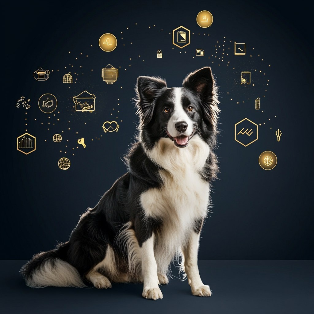 Создано на основе запроса: elegant navy blue background with several golden icons representing learning, on the left side an elegant border collie sitting hyperrealistic 8k