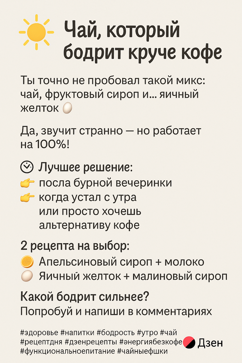 ☀️ Тонизирующий чай, который удивит! Необычное сочетание чая, фруктового сиропа и даже... яичного желтка! Да-да, звучит странно — но работает на 100% 💥 ⏰ Для утра после бурной ночи или просто как заряд энергии вместо кофе. 🫖 Варианты: 🍊 с апельсиновым сиропом и молоком 🥚 с желтком и малиновым сиропом Попробуй — и расскажи, какой бодрит сильнее 😉 #тонизирующийнапиток #чайдня #утроначинаетсясчая #функциональныйнапиток #похмельемода #энергияизчая #чайсрецептом #утро #чайныйтест #безкофеина https://t.me/Crumzo