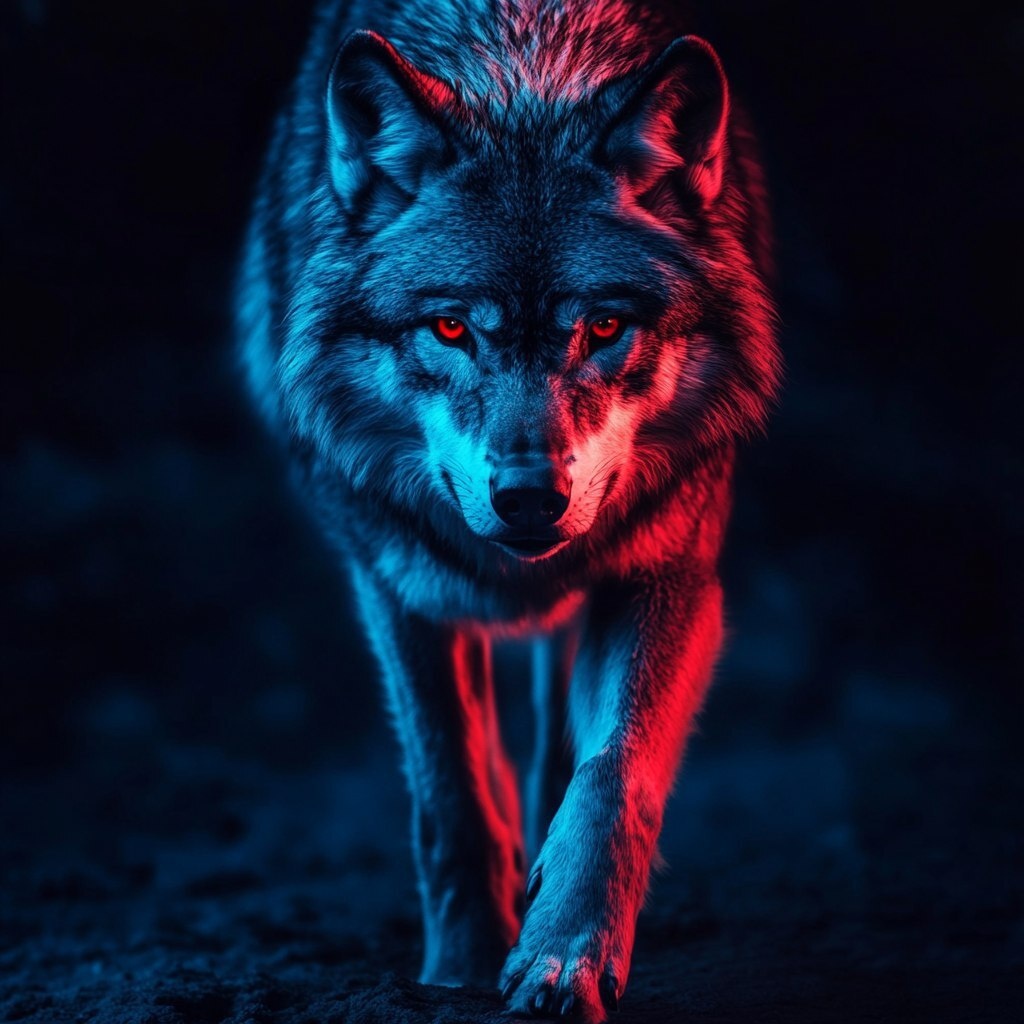 Создано на основе запроса: fearless Wolf staring front, walking , realistic photo , red and blue light and dramatic effect, highly detailed