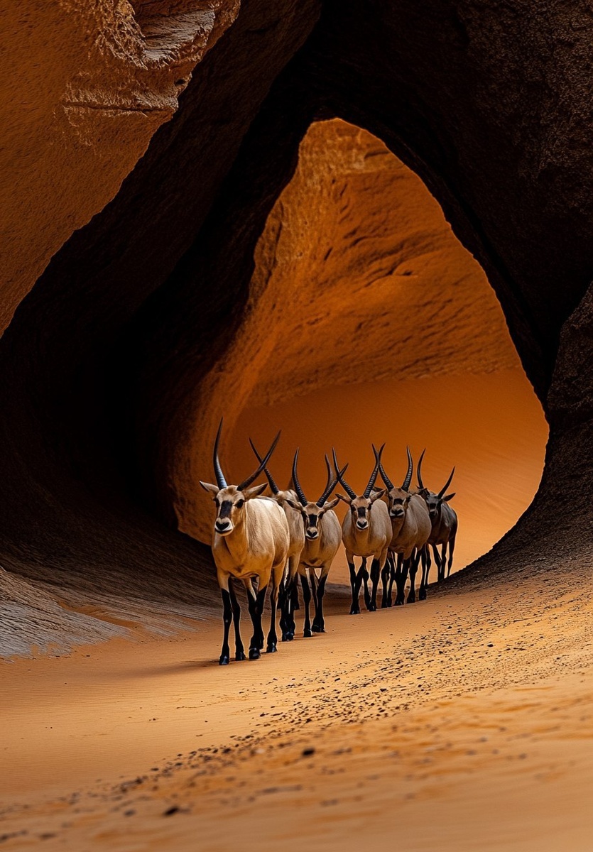 Создано на основе запроса: a canyon in the desert of Saudi Arabia. A group of arabian oryxes are walking in a canyon. The floor is covered by fine orange sand and sunrise beams through the hole in the rocks. High contrast, sharp focus, hyper-realism, high resolution, high detail. cinematic, Rembrandt lighting, chiaroscuro. Minimalist, blurry background --- Автоперевод: Каньон в пустыне Саудовской Аравии. Интересно выглядит? 🤔 https://dzen.ru/id/65c0c65c86e4f837c27b24d7 #ИИ #AI #нейросеть #midjourney #art
