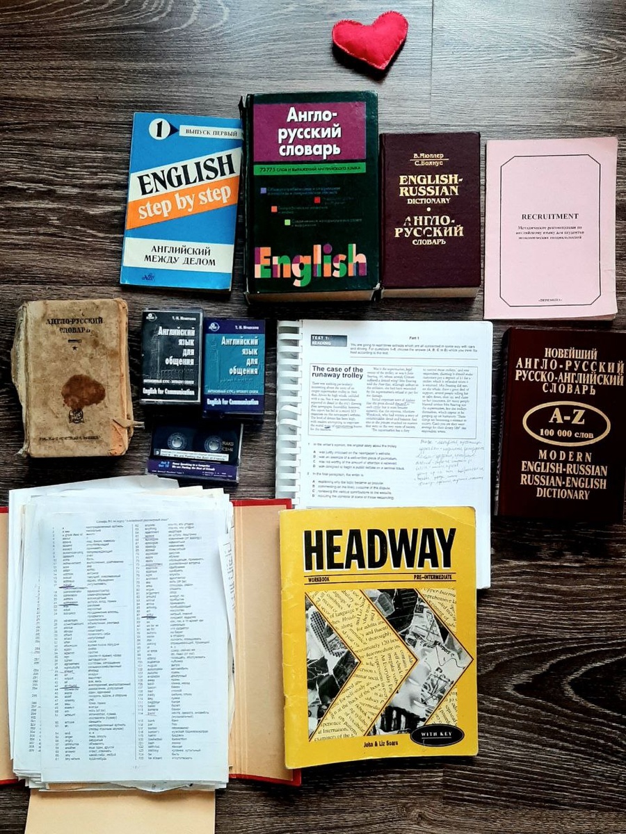 Английский сквозь года☺️ Минутка ностальгии - сегодня разбирала стенку и понаходила много всего, что помогало мне учить язык много лет. Слева - помощники 90х: аудиокассеты, изодранный в хлам словарик и материалы к видеокассетному курсу, а справа более современные штуки 2000х - словари и учебники🤗 Что-то из этого мне дарили на ДР, что-то я стырила у двоюродного брата, что-то привозила дочь бывшего начальника отца из Америки - в общем, я искала все возможные способы учить английский. И ищу по сей день. В связи с этим у меня (в)опрос😁⬇️ #личное