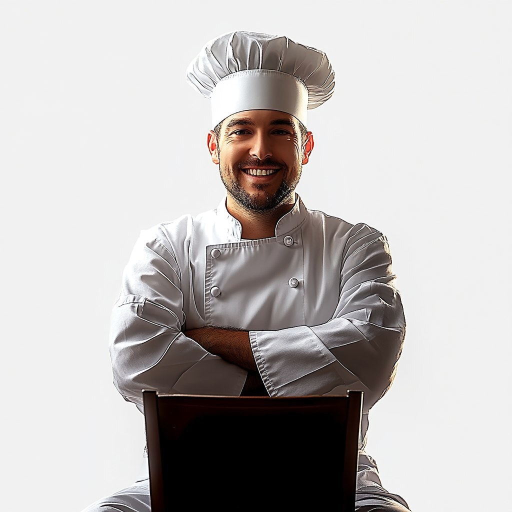 Создано на основе запроса: chef, wearing chef hat. Front view, upper body, white background, male chef in mid-30s with happy expression.
