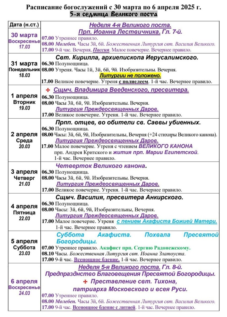 30.03-06.04. Расписание богослужений на Архиерейском подворье храма преп. Сергия Радонежского села Стоянцево