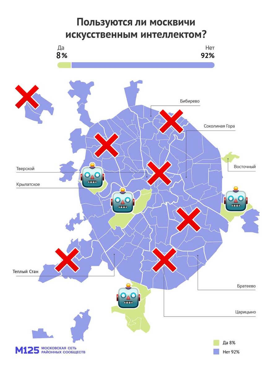 Свежий Мосопрос показал, что искусственный интеллект еще не захватил Москву. Пока в Голливуде снимают фильмы про бунт машин, у нас всего 36,5% жителей вообще используют нейросети. А в 92% районов они даже не заглядывали.