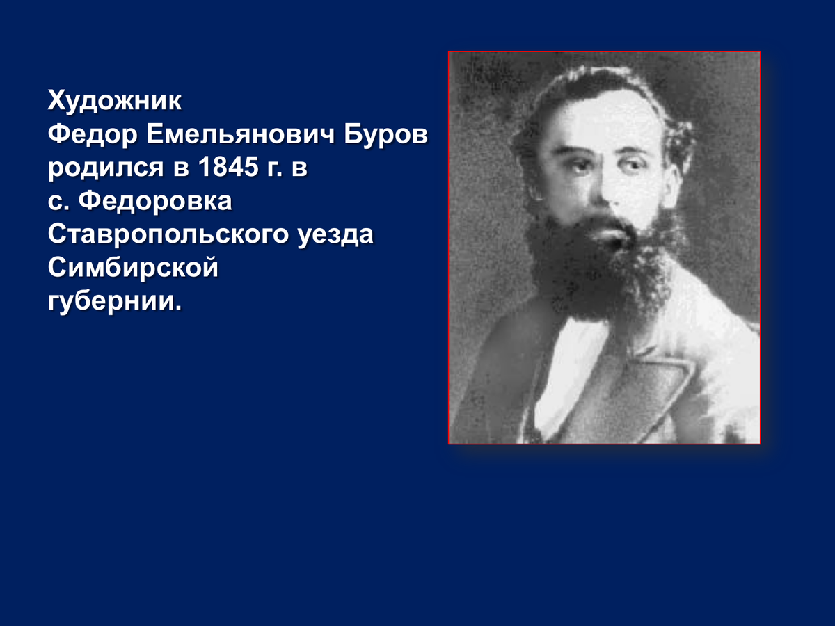 Одна картина в Русском музее, три-четыре портрета в других собраниях хранят имя мало кому известного живописца Фёдора Емельяновича Бурова (1845—1895). А в своё время Буров был известным художником, жанристом и историческим живописцем, кроме того, немало сил отдал он развитию художественного образования в Самаре.