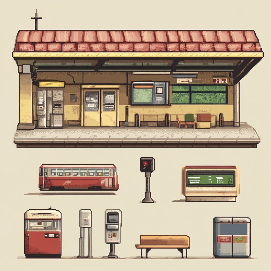 Создано на основе запроса: a set of 8 bit illustrations of things found in train stations