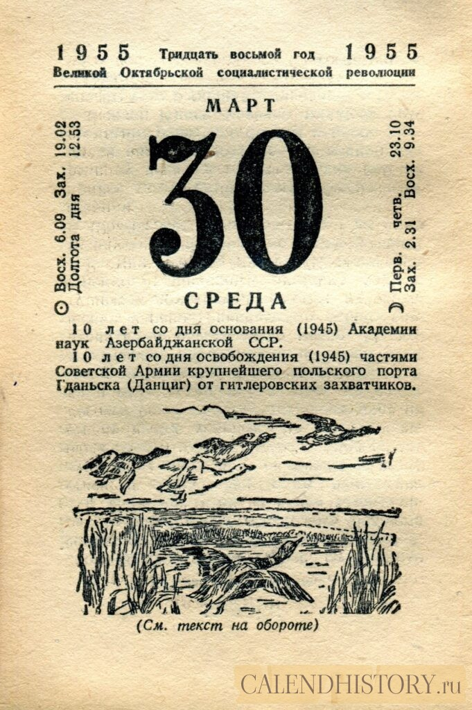 Итак, сегодня 30-го марта и у нас на календаре 1955-й год. Перед нами листок советского календаря Политиздата. На календаре у нас среда - 30 марта 1955-го года. 10 лет со дня основания (1945) Академии наук Азербайджанской ССР. 10 лет со дня освобождения (1945) частями Советской Армии крупнейшего польского порта Гданьска (Данциг) от гитлеровских захватчиков. *** Оборотную сторону листка этого календаря можно посмотреть у нас по ссылке на сайте. Другие листки советских календарей смотрите у нас на сайте - CALENDHISTORY.ru ПОСМОТРИТЕ ЕЩЁ ЛИСТКИ ОТРЫВНЫХ КАЛЕНДАРЕЙ: