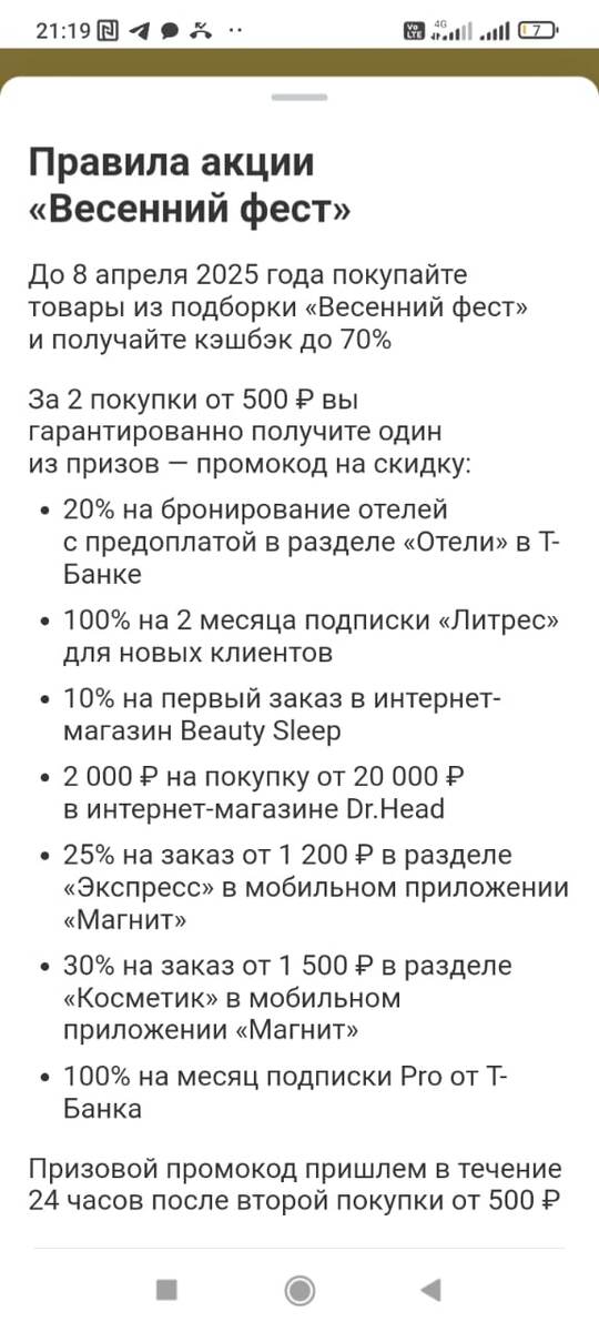 У Т-банка часто много интересных и выгодных акций, вот сейчас они решили провести весенний фестиваль кэшбэка. Для нас, покупателей, это отличная возможность сэкономить на продуктах, одежде, обуви и страховании жилья. Плюс призы еще получить. Подробнее сейчас расскажу. До 8 апреля в разделе Весеннего феста вас ждут больше десятка интересных предложений, которыми просто грех не воспользоваться. При этом за каждые 2 покупки от 500 рублей вы будете получать гарантированные призы, вот такие: Мне нравится скидка 30% на заказ в разделе «Косметика» приложения «Магнит», и у них же 25% скидки на экспресс-доставку. Но и Pro от Т-банка на месяц бесплатно тоже вариант. 10% на покупки в Ашане — от 5 000 рублей. Многовато по сумме, но как вариант. Там же и бытовая химия еще, и косметика, и товары для дома. Можно набрать всего сразу много. 20% на покупки в Zolla, на кассе. Покупка должна быть от 3 000 рублей. Это одежда, кто забыл, аксессуары, домашняя обувь, вот такое все. 17% кэш на одну покупку на
