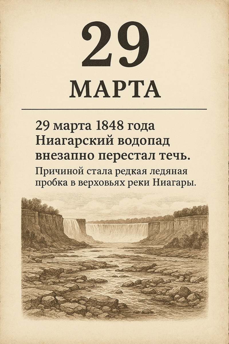 29 марта 1848 года Ниагарский водопад внезапно перестал течь. причиной стало редчайшее природное явление — ледяная пробка в верхнем течении реки Читать на сайте: https://mir-ltd.ru/articles/society/29-marta-1848-goda-niagarskiy-vodopad-vnezapno-perestal-tech/