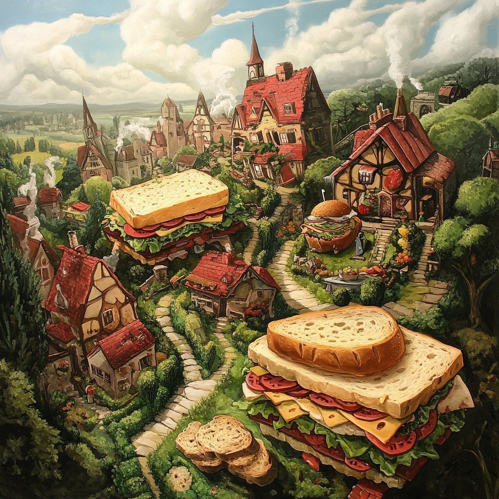 Создано на основе запроса: a town landscape but all the pieces of the buildings are sandwich ingredients