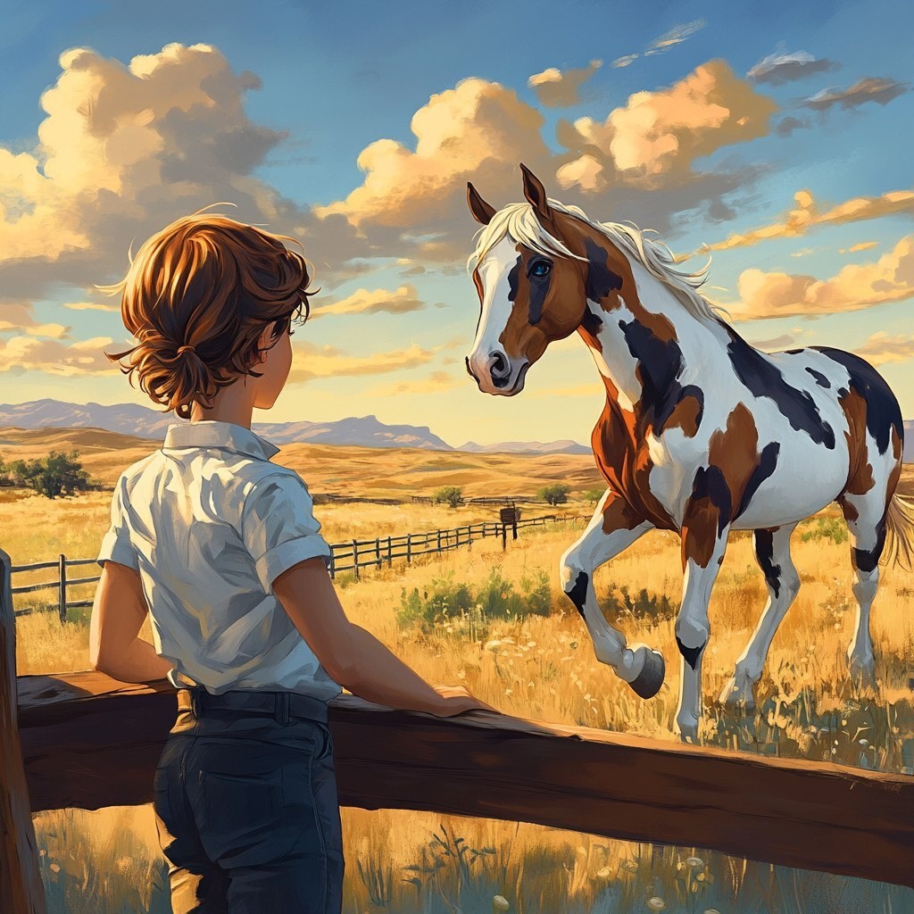 Создано на основе запроса: 10 year old girl, short brown hair, blue eyes, freckles, standing with her arms folded over a split rail fence facing a colorful paint horse spotted with large patches of golden brown and creamy white blended with white, black and brown as it runs across an arizona field, full body shot, illustration, 4k, blue sky, golden green field at golden hour sunset and dry arizona mountains in the distance --- Автоперевод: 10 -летняя девочка, короткие коричневые волосы, голубые глаза, веснушки, стоящие руками, сложенные на расколочном ограждении, обращенной к красочной краски Как тебе эта иллюстрация? 🤔 https://dzen.ru/id/65c0c65c86e4f837c27b24d7 #ИИ #AI #нейросеть #midjourney #art