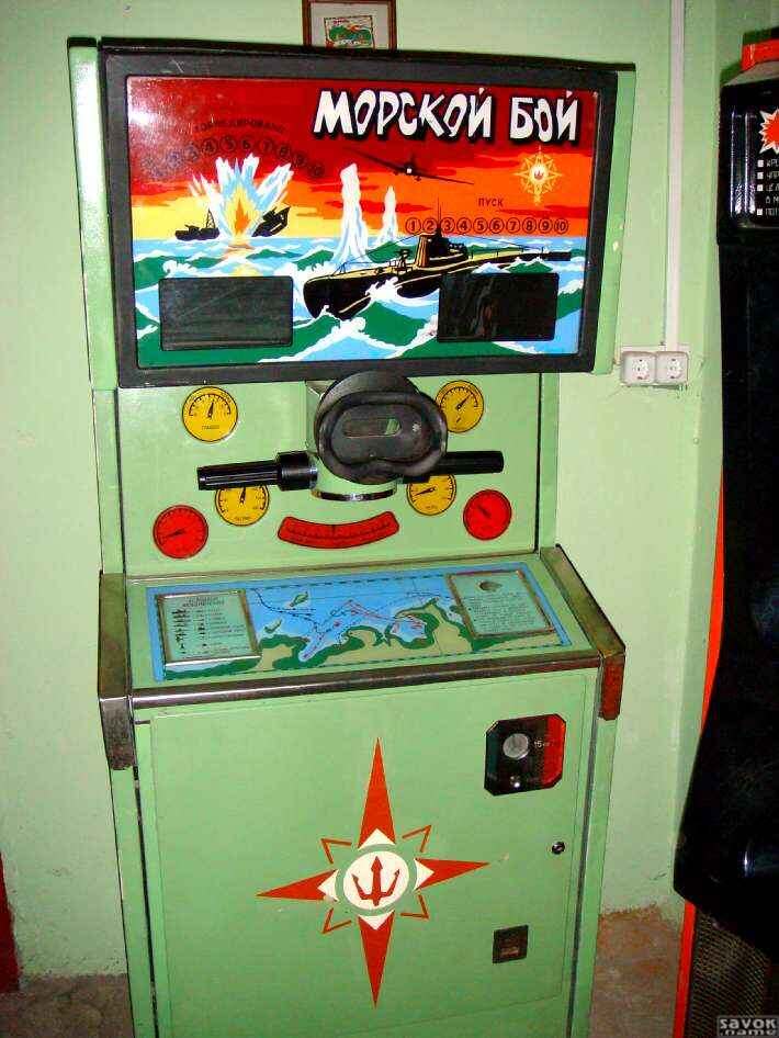 Привет, друзья! Сегодня я расскажу вам про игровые автоматы СССР. Эти игры вызывают ностальгию, и приятные воспоминания тех лет. Подобные игры безусловно запомнились на на долго и они были ламповыми, причём в прямом смысле этого слова. Взять допустим тот же морской бой. Основная действующая единица, была лампочка символизирующая торпеду. Игрок смотрел в перископ, перед ним открывался панорамный вид на море, и тут на горизонте появлялись вражеские корабли. Игрок, произведя корректировку скорости корабля, отжимал на кнопку «огонь», расположенную на одной из ручек перископа. Траектория полета торпеды подсвечивалась под поверхностью воды, и когда игрок попадал в корабль, виднелась вспышка взрыва, и корабль тонул. При промахе корабли продолжали свое движение. Всего игра запускала 10 пусков торпед. Если будут потоплены все 10 кораблей, игрок получал еще три бесплатных пуска. Чтобы создать ощущение глубины, использовались зеркала, а сам механизм перемещения кораблей находился близко к