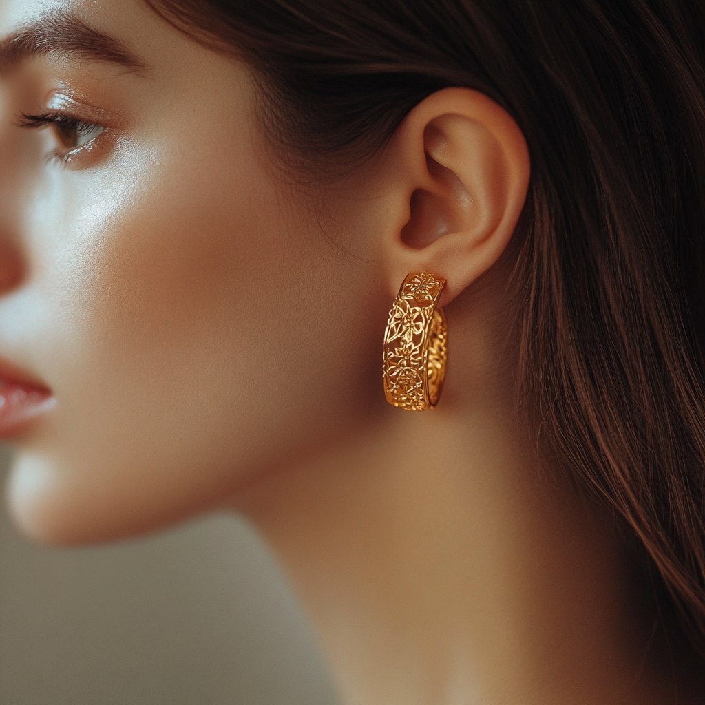 Создано на основе запроса: Create Delicate gold huggie earrings inspired by intricate lace patterns, featuring fine filigree details and soft scalloped edges. The earrings have a modern yet romantic coquette aesthetic, with a polished 18k gold finish and subtle floral or bow-inspired motifs. Lightweight and elegant, designed for everyday wear with a touch of vintage femininity.