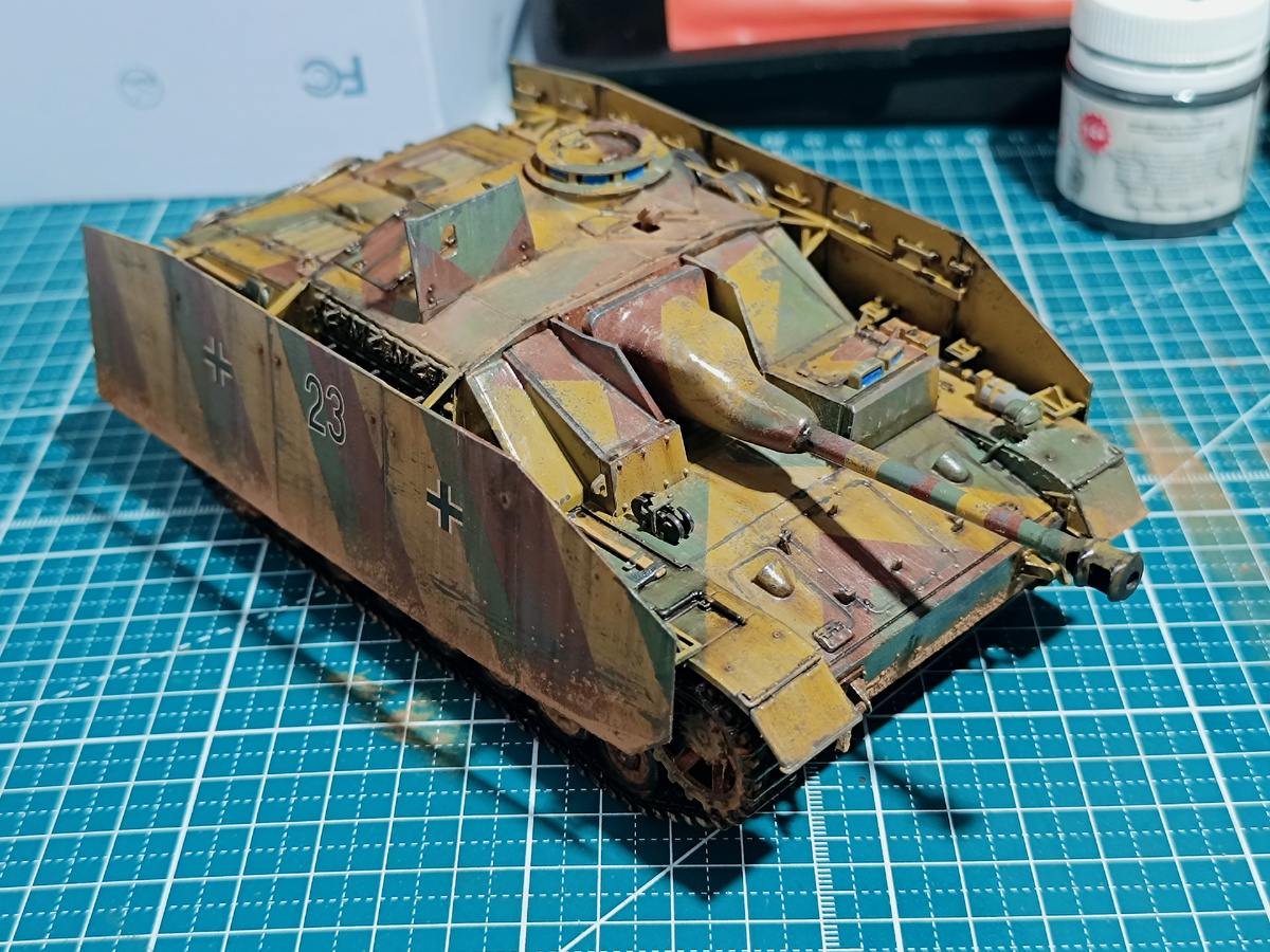Все хорошее когда нибудь заканчивается. В случае со стройкой ШтуГа - моя "проба пера" во полноценном воплощении стендовой модели по полному циклу. Тут тебе и прешейдинг, и трехцветный камуфляж, проработка гусениц и чиппинг, масляные точки и, наконец, пигменты и смывки.
