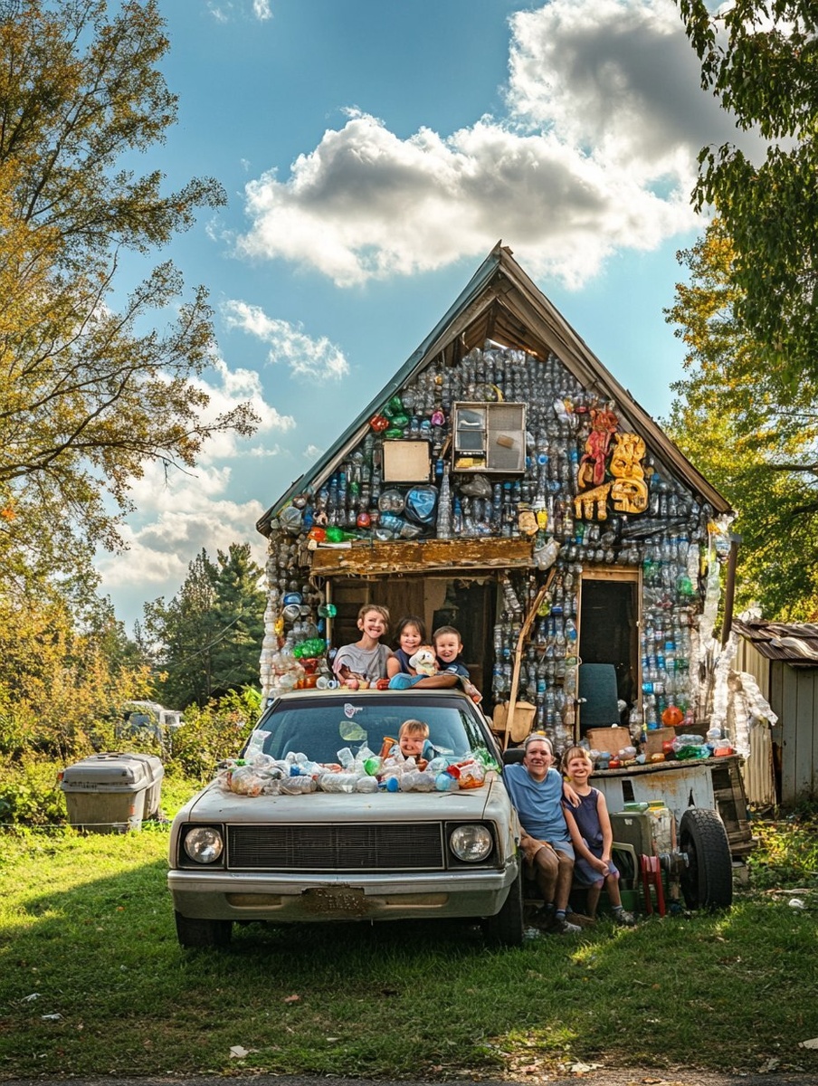 Создано на основе запроса: a photograph of a makeshift house built entirely from plastic bottles, used metal trash, and repurposed lumber. A family of four is smiling on the front lawn. There is an old car in the driveway with a makeshift trailer. Sunny afternoon with a few clouds in the sky. Sony A65 camera. --- Автоперевод: Фотография импровизированного дома, построенного исключительно из пластиковых бутылок, использованного металлического мусора и перепрофилированного пиломатериала. Как тебе иллюстрация? 🤔 https://dzen.ru/id/65c0c65c86e4f837c27b24d7 #ИИ #AI #нейросеть #midjourney #art