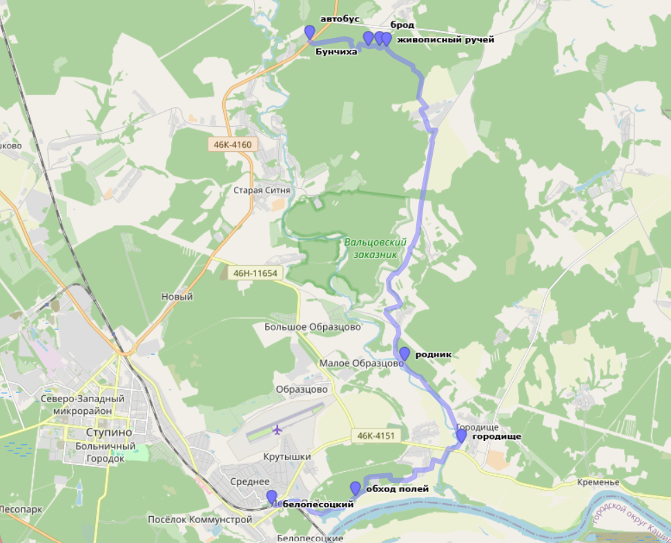 При выходе из пригородного района г. Ступино находится первый «перевал» на маршруте — насыпь разобранного железнодорожного пути Ступино-Кашира.