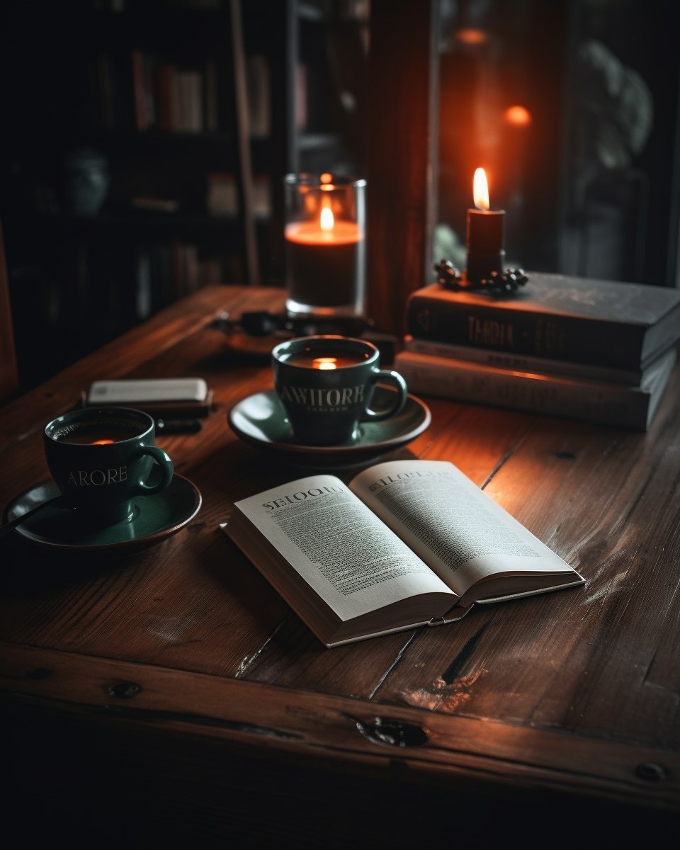 Создано на основе запроса: Book cover of a thriller novel on a dark wooden table, moody warm lighting, coffee mug and candle, cozy yet mysterious vibe --- Автоперевод: Книжная обложка триллера на темном деревянном столе, капризное теплое освещение, кофейная кружка и свеча, уютная, но таинственная атмосфера Интересно получилось? 🤔 https://dzen.ru/id/65c0c65c86e4f837c27b24d7 #ИИ #AI #нейросеть #midjourney #art