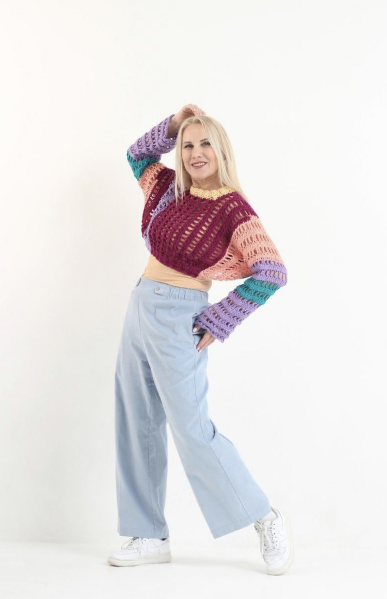 В мире массового производства авторская одежда становится настоящим сокровищем. Этот укороченный джемпер, связанный крючком из полушерсти, — не просто элемент гардероба, а произведение искусства, созданное в единственном экземпляре. Почему стоит выбрать этот джемпер? 1. Уникальность ручной работы - Каждая петля связана вручную, что гарантирует идеальную посадку по фигуре. - Единственный экземпляр — у вас точно не будет «двойника». 2. Комфорт и практичность полушерсти - Тепло и воздухопроницаемость: полушерсть согревает, но не перегревает. - Мягкость:не колется, в отличие от чистой шерсти. - Прочность: сохраняет форму даже после многократных стирок. 3. Универсальность укороченной модели - Подчёркивает талию и сочетается с высокими брюками или юбками. - Идеален для многослойности: над платьем, с рубашкой или водолазкой. - Удобная длина не сковывает движения. Как создаётся джемпер? 1. Выбор пряжи: Используется качественная полушерсть с добавлением акрила или хлопка для эла