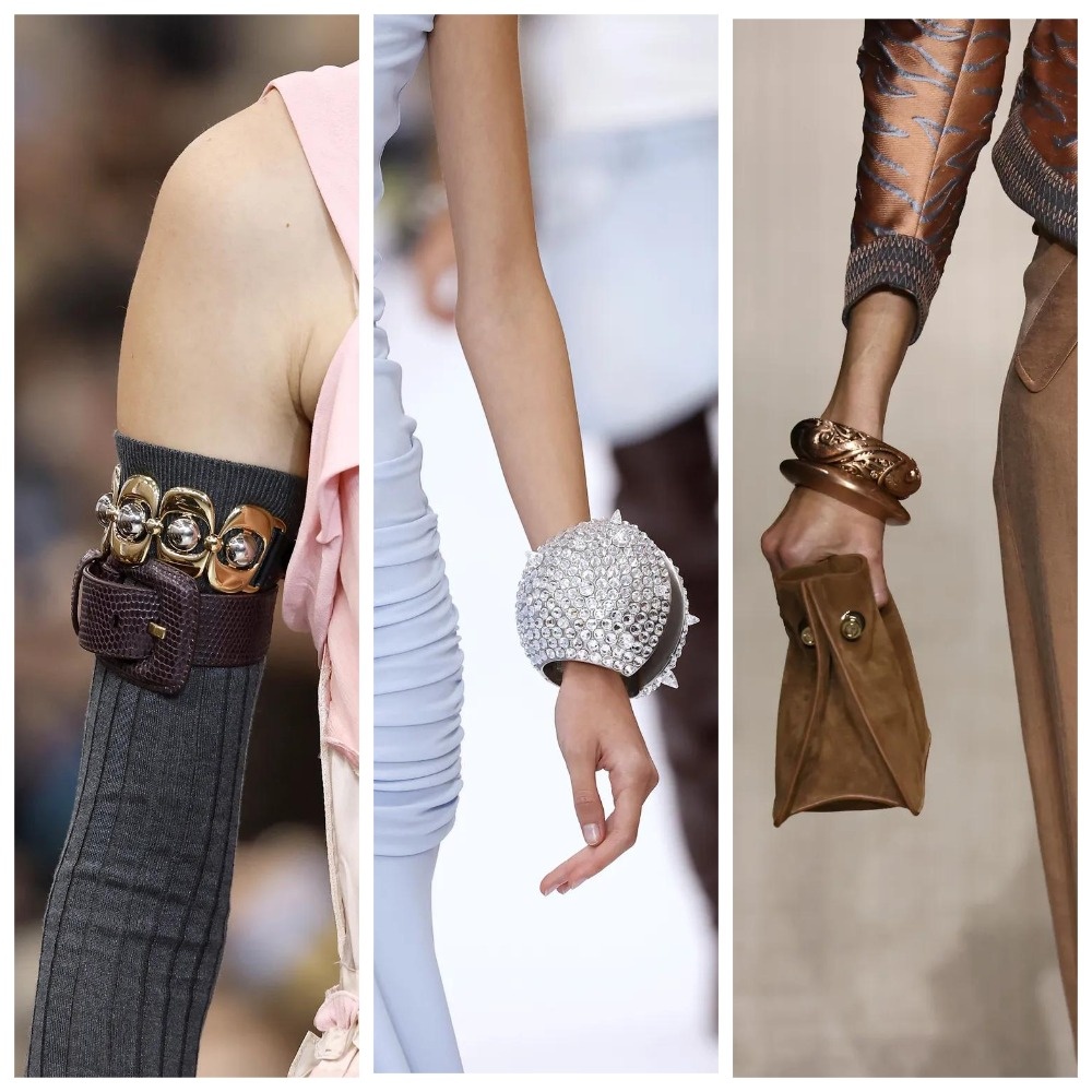 Давайте начнём с самого нашумевшего тренда в этой категории — массивных браслетов. Мы носим их уже не первый сезон, причем не только на запястье, но и на предплечье. Но в этом году на подиумах доминирует стилизация, когда такой браслет надевается поверх одежды — лонгслива, рубашки и даже оперных перчаток.
