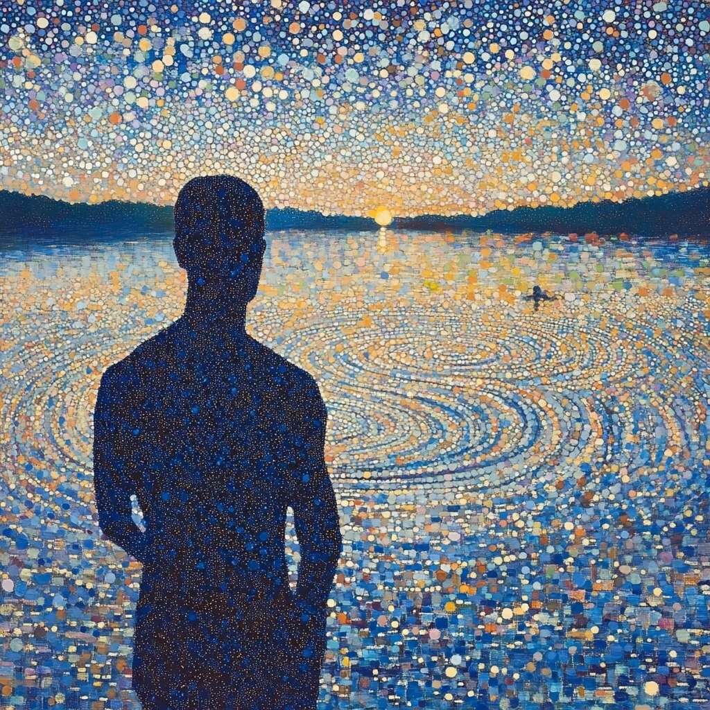 Создано на основе запроса: pointillism technique MAN AGAINST A BACKGROUND OF A LAKE WITH CIRCLES GOING ON THE WATER all in light tones all