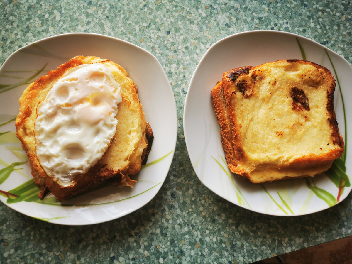 Сегодня наш воскресный завтрак будет также из Франции. В последние годы эти сэндвичи часто упоминались в кулинарных шоу. Поэтому я решила приготовить их сама. Знакомьтесь - Крок-Мадам и Крок-Месье. Что нам понадобится: 4 ломтика хлеба Ветчина Сыр Молоко или сливки 2 яйца Сливочное масло Соль и сахар Берем кусок хлеба, у меня был хлеб для тостов. В идеале это должна быть булочка бриошь, но такую найти сложно. Поэтому у меня тостовый хлеб. Небольшой совет, лучше чтобы хлеб был слегка черствым. У меня был свежий и он норовил развалиться 😁 И так берём кусок хлеба, на него кладём кусок сыра и кусок ветчины Желательно, чтобы они были примерно такого же размера как и хлеб. Затем берём второй кусок хлеба, кладём на него сыр и накрываем первый сыром вниз Вот такой сэндвич выходит Делаем такой второй сэндвич. В небольшой миске смешиваем небольшое количество молока и яйцо, щепотку соли и малюсенькую щепотку сахара. Я наливала молоко на глаз, так чтобы кусок хлеба мог погрузится в смесь. Ра