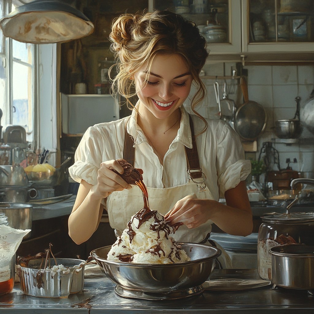 Создано на основе запроса: photo real image, dingy kitchen, smiling woman adds chocolate syrup on ice cream