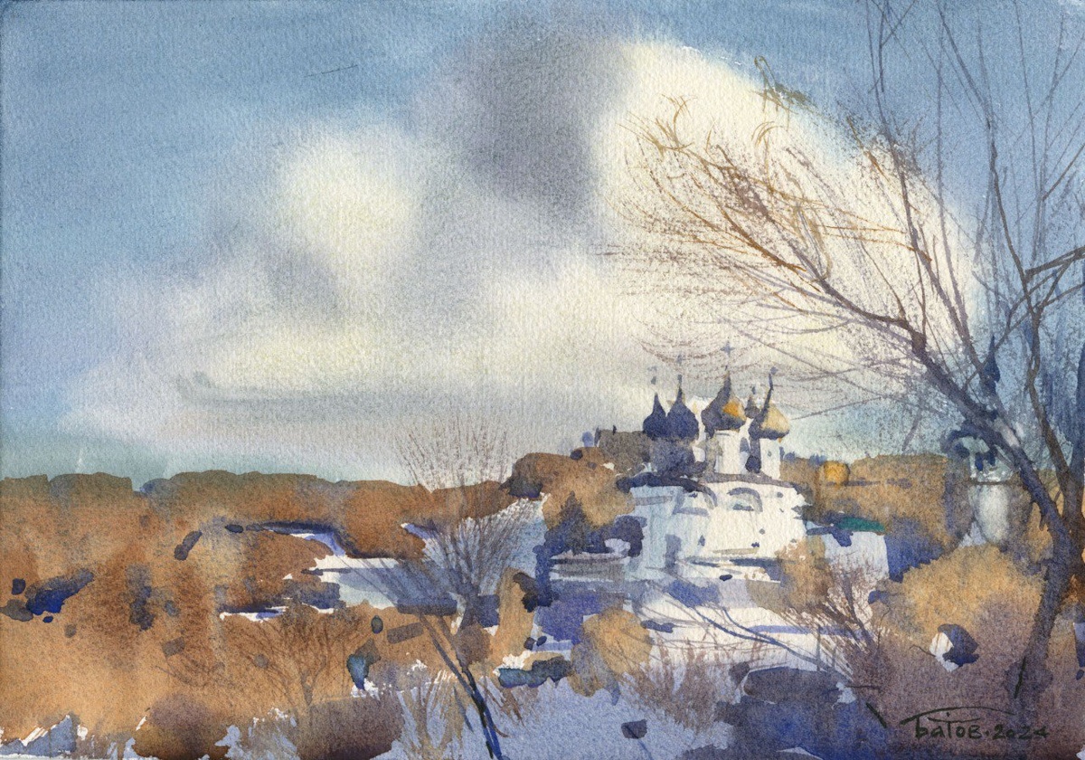20250321 Вятские мотивы / Spring motif / 21x30 см. Демонстрационный этюд с мк в Кирове. Конструирование пейзажа. Constructing an imaginary landscape. Краски Pinax Extra. Бумага 100% хлопок Палаццо 300 гр. #акварель #живопись #watercolor #pinax_extra #palazzo_watercolor_paper #Изо #watercolorsketch #ArtBatDiversion #artLesson #мастеркласс