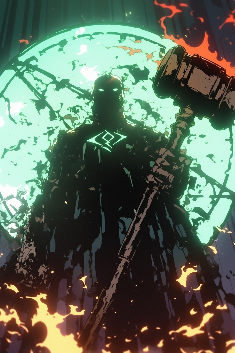Создано на основе запроса: anime style the ambassador of the justice League hero crusader crushing government with a giant gavel red