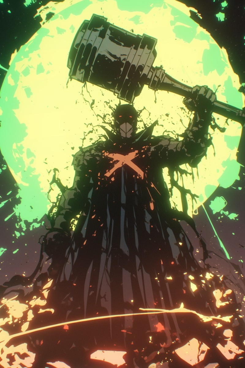 Создано на основе запроса: anime style the ambassador of the justice spawn hero crusader crushing government with a giant gavel red