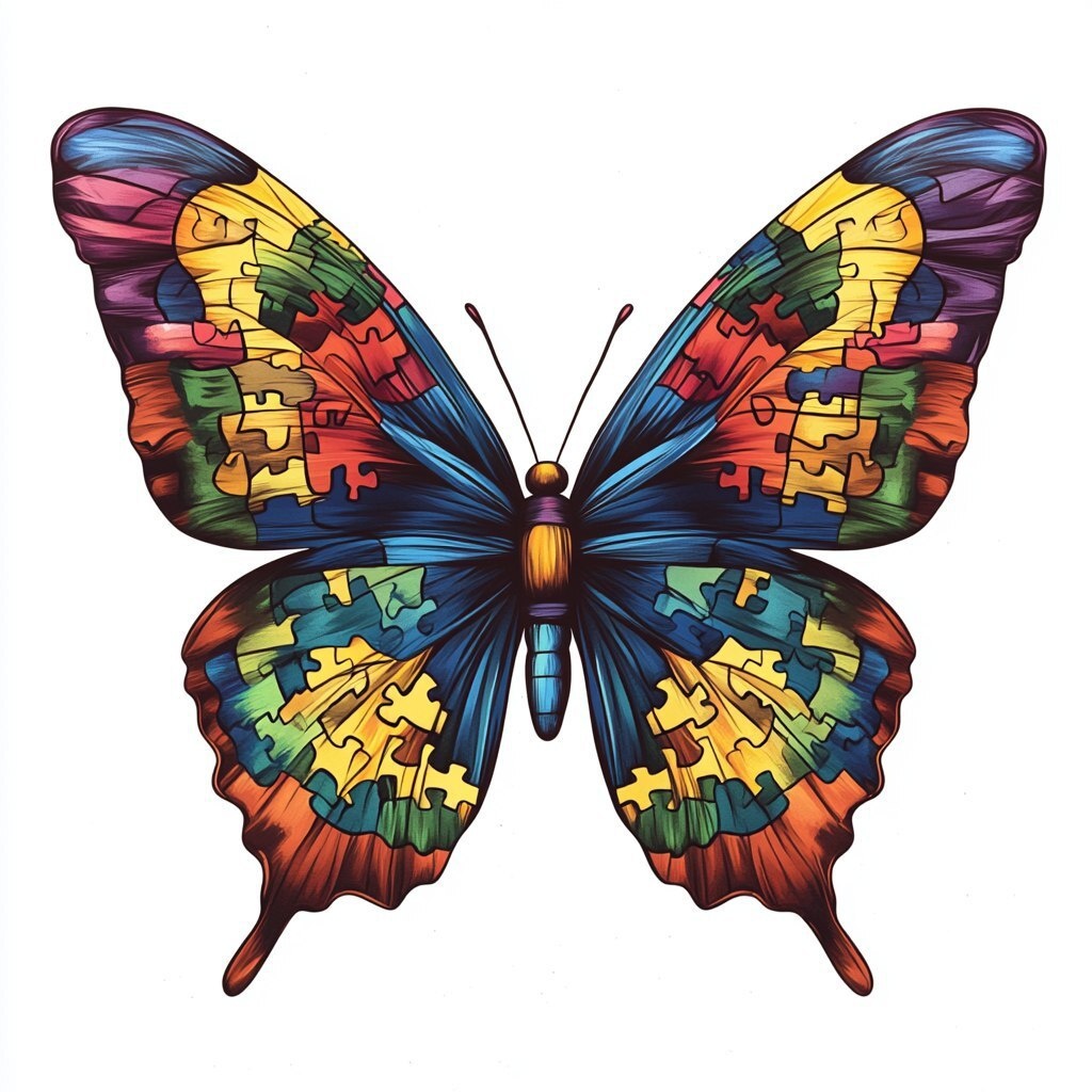 Создано на основе запроса: a butterfly with puzzle piece wings, symbolic autism awareness design with intrinsic colors